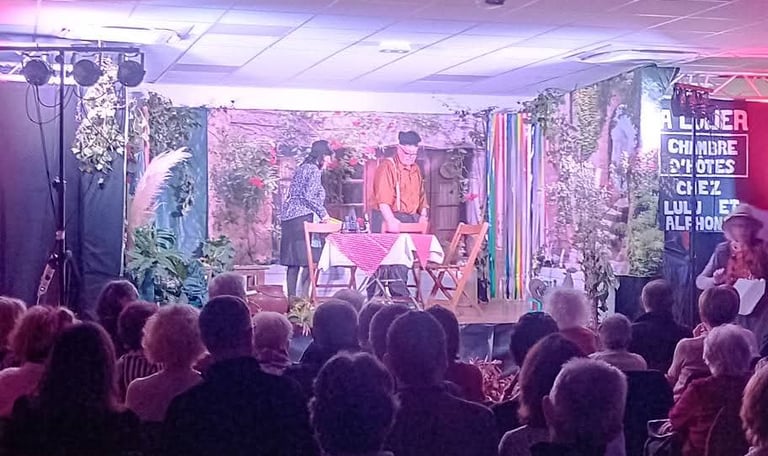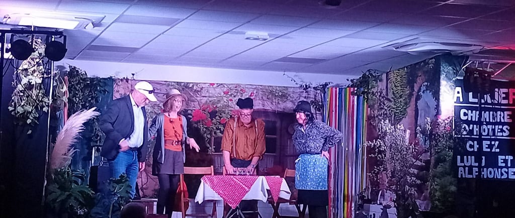 Il est des soirées où le théâtre prend des allures de fête de village, où la scène et la salle respirent à l’unisson. Ce fut exactement l’atmosphère de notre représentation de « Confiture et pâté de blaireau » à Vicq‑d’Auribat, accueillis avec une générosité rare par les habitants du village.
