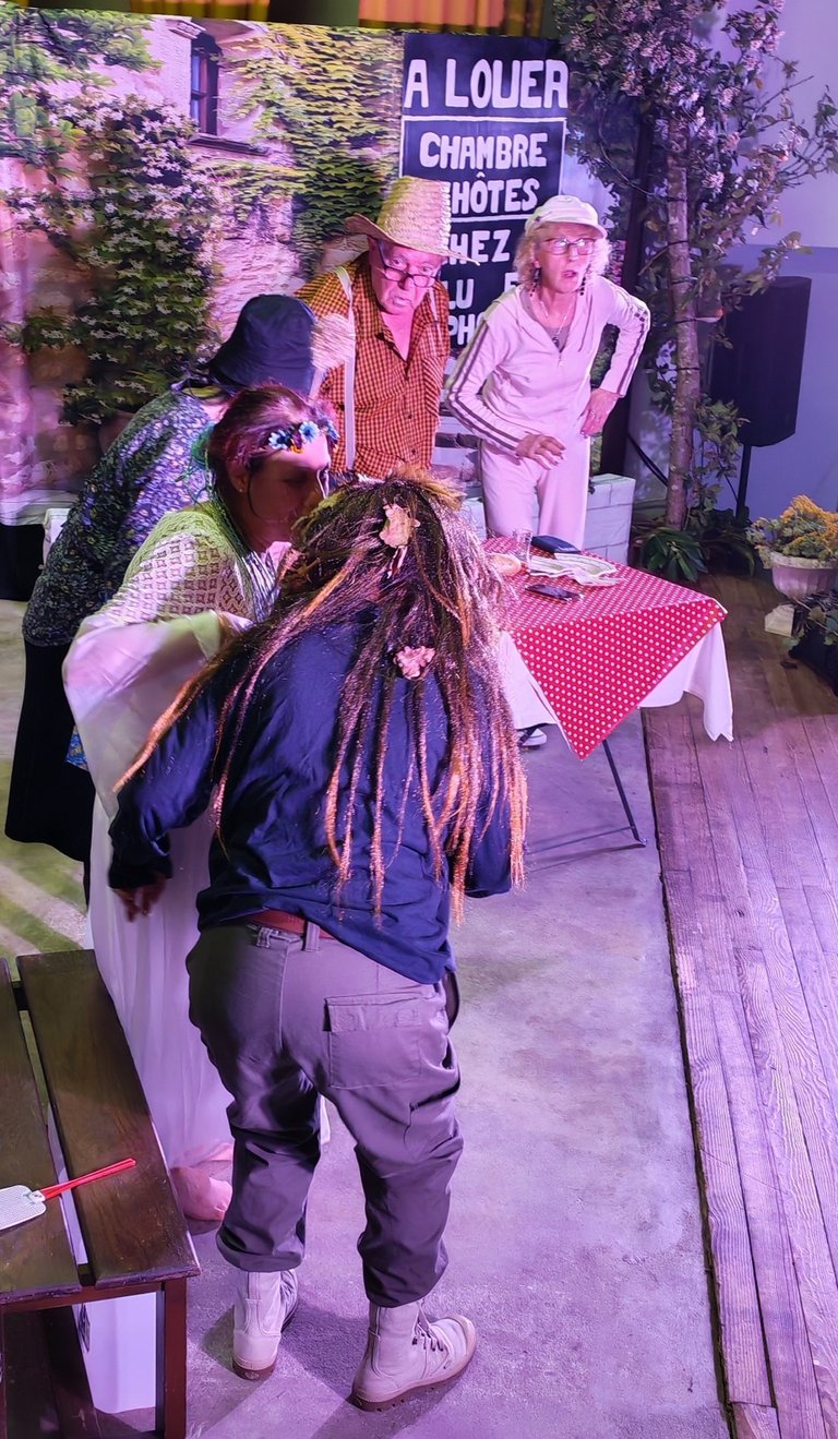 Notre pièce nous entraîne dans la rencontre savoureuse entre deux mondes. D’un côté, Jessie et Gabriel, couple de Parisiens débarquant avec leurs valises — et sans doute quelques illusions — à la recherche d’un séjour au vert. De l’autre, leurs hôtes, Lucienne et Alphonse, figures rurales hautes en couleur, propriétaires d’un gîte pour le moins… singulier.